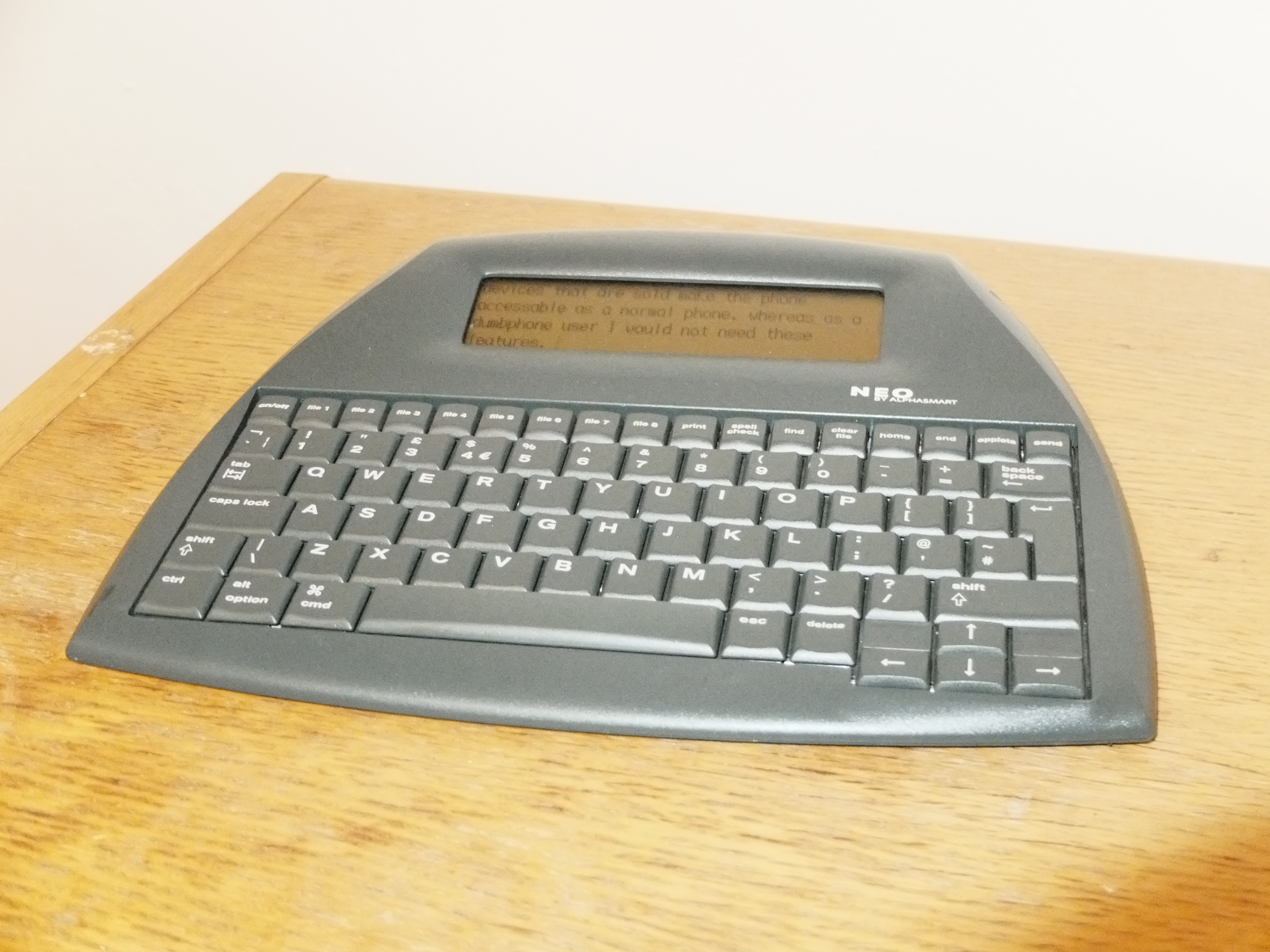 The AlphaSmart has a full sized keyboard which is satisfying to type on, and even supports a few shortcuts for navigating between, selecting and deleting words and lines at a time.1 The device turns on almost instantly, can be locked with a password2 (though I suspect there's nothing preventing the files being accessed via usb), and the battery lasts for months - I haven't had to change batteries since I got it at the start of the year. It's features are minimal, providing nothing beyond writing txt files, and sending them to your computer.