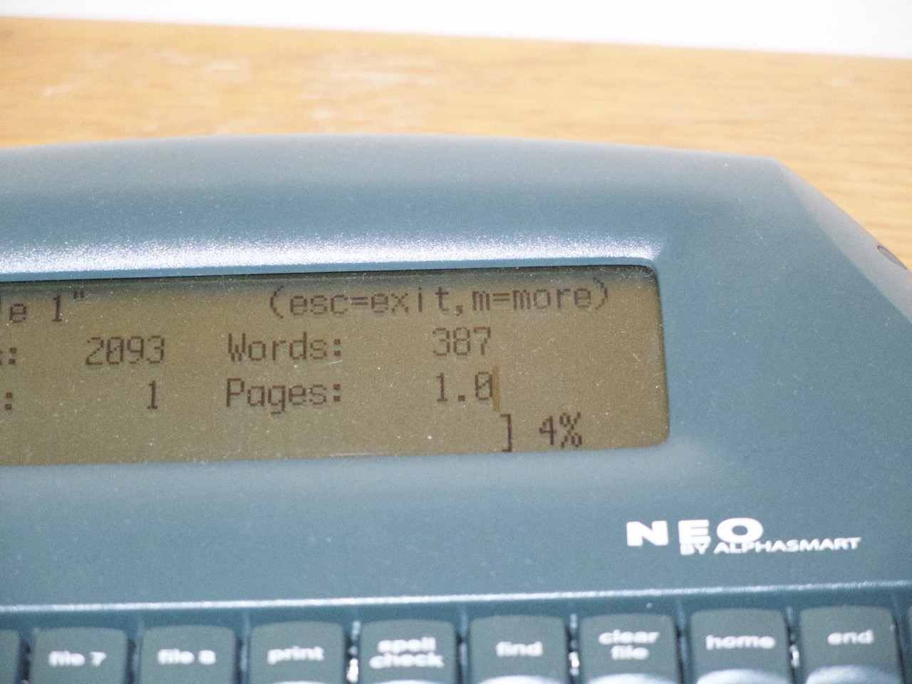 I've been using the AlphaSmart to write a daily journal. I've started the habit of beginning each day by brain dumping 750 words on it. In the past I've journaled on paper about what happened at the end of each day, partly with the intention of keeping a permanent record of my life. With the AlphaSmart I'm doing the opposite, I'm using it as a tool for self-reflection and try to focus on writing about how I'm feeling, with no intention of looking back on what I wrote. In fact, each morning when I write the next one I overwrite the previous file. I find that because I can type much faster on the Neo than I can write by hand, and because its sole focus is on output, I'm able to get into a kind of flow state where I get down whatever is on my mind. I've found it to be quite therapeutic and a good way to start the day, by becoming intentional about the day ahead. The screen is tiny but that's actually helpful in focussing on writing rather than editing your work, and while the functions are basic you can perform a word count (press CTRL + w) and spellcheck.
